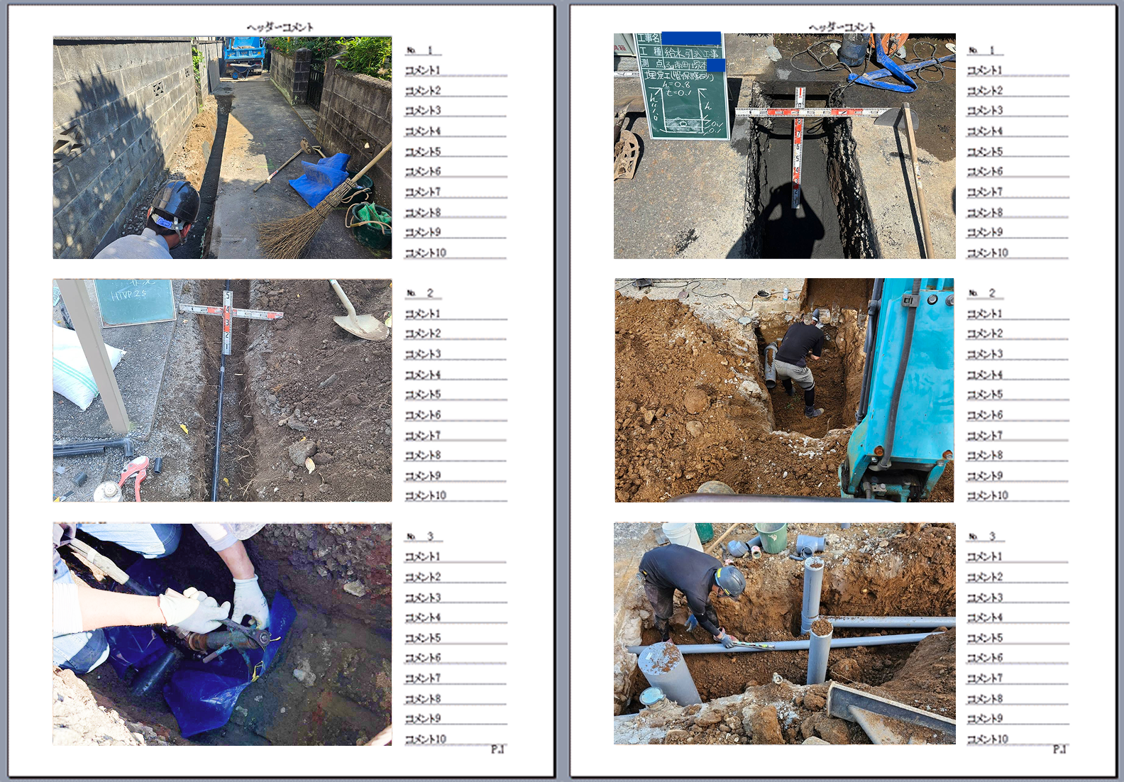 掘削 → 配管 → 本管取出し → 止水栓・メーターボックス設置 → 舗装復旧。写真台帳も実施。